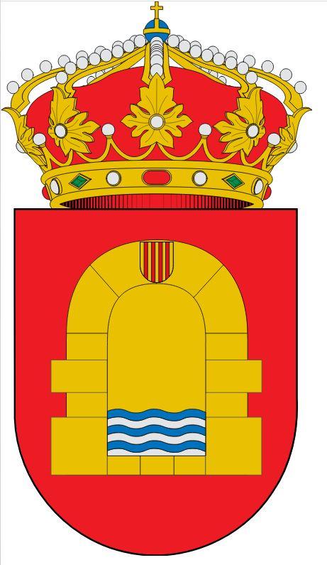 Cuadrilongo de base circular. En campo de gules, una portada de sillares, de oro, aclarada de lo mismo, con la clave cargada de escudete con el Señal Real de Aragón; en la punta, dentro de la portada, seis ondas de azur y plata. Al timbre, Corona Real cerrada de España.